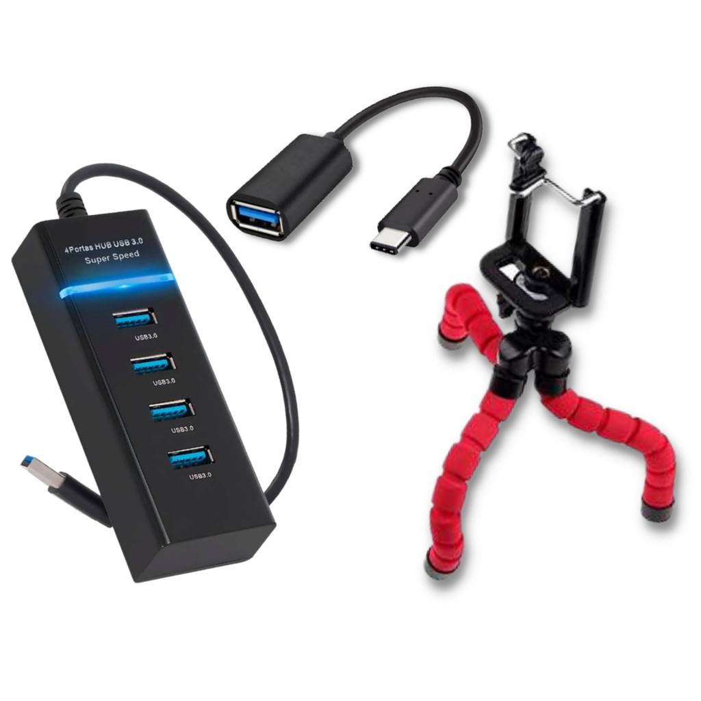 Kit Mobilador Hub Usb 3.0 Ultra Rapido 4 Portas + Adaptador Otg Usb Tipo C Ou Micro Usb + Suporte Tripe Flexivel Premium