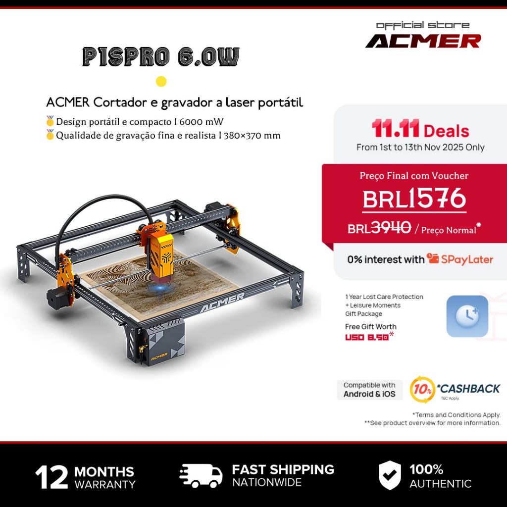 Comprar na ShopeeAcmer Máquina de corte a laser P1 S Pro 6W(6000 mW) Alta Precisão 10.000mm/min, Classe 4, 380×370mm