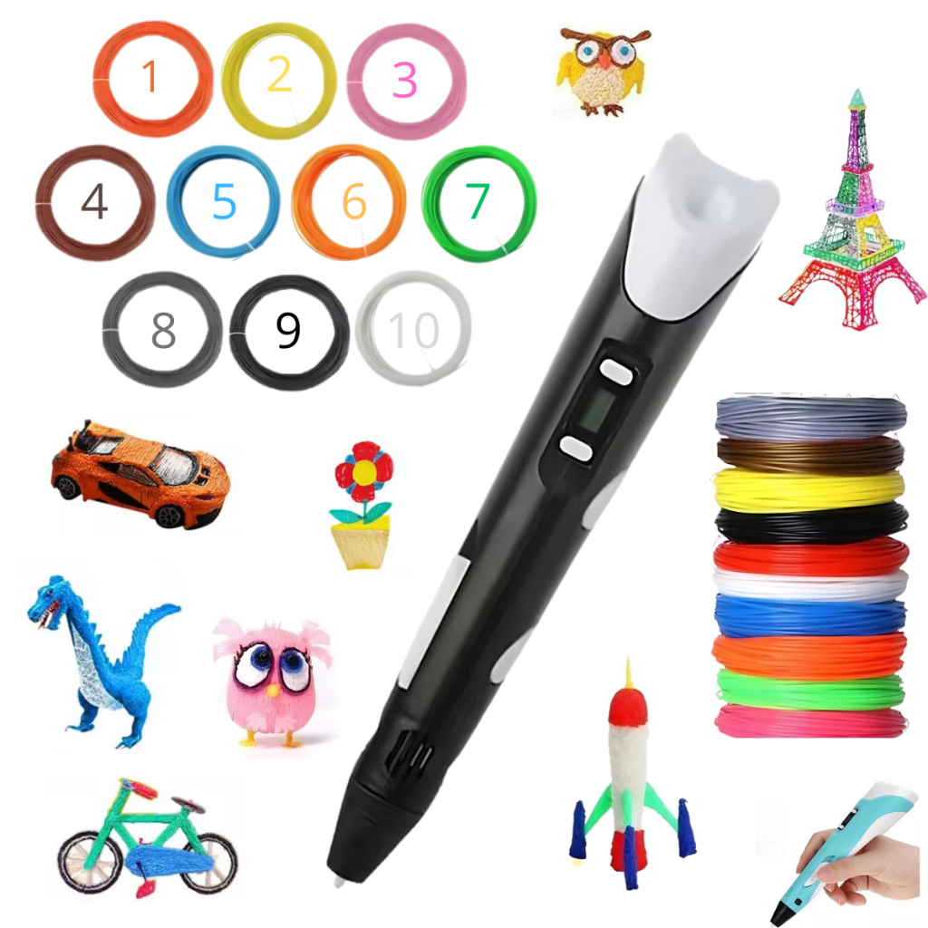 Kit Caneta Preta 3d Impressora + 10 Refil Filamento Colorido 59 Metros Brinquedo Educativo Desenho Criativo Magica