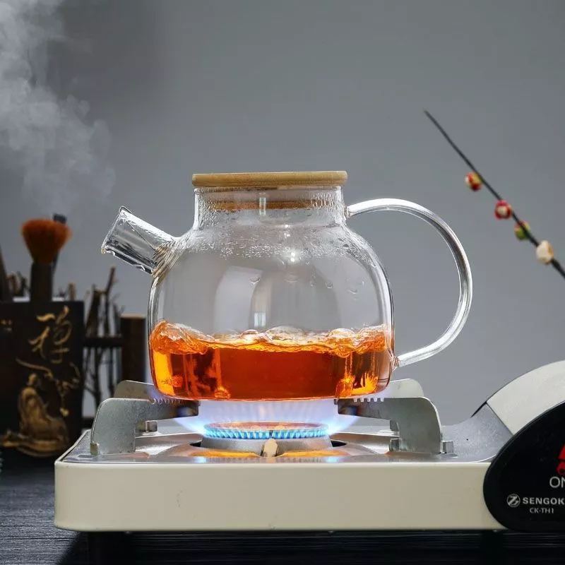 Chaleira de Vidro com Coador no Bico e Tampa de Bambu1 L Vai no Fogo