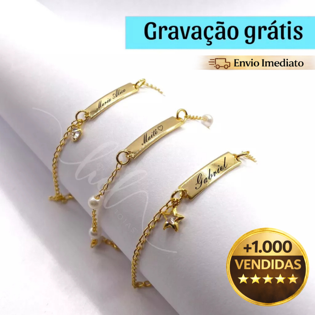 Pulseira Infantil Bebê RN Pingente Personalizada Dourado Com Gravação Nome Banhada a Ouro 18k