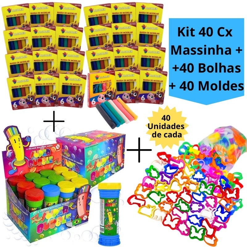 Kit 40 Cx Massinha de Modelar + 40 Bolhas de Sabão + 40 Molde Cortador Kit Festa Forminha Lembrancinha Infantil Escolar