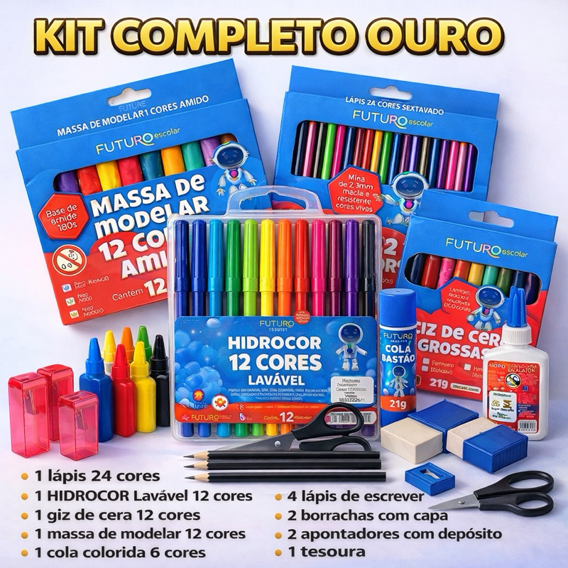Comprar na ShopeeKIT ESCOLAR COMPLETO OURO 24 LÁPIS DE COR + 12 GIZ + 12 MASSAS + 12 HIDROCOR + COLAS + TESOURA + ACESSÓRIOS