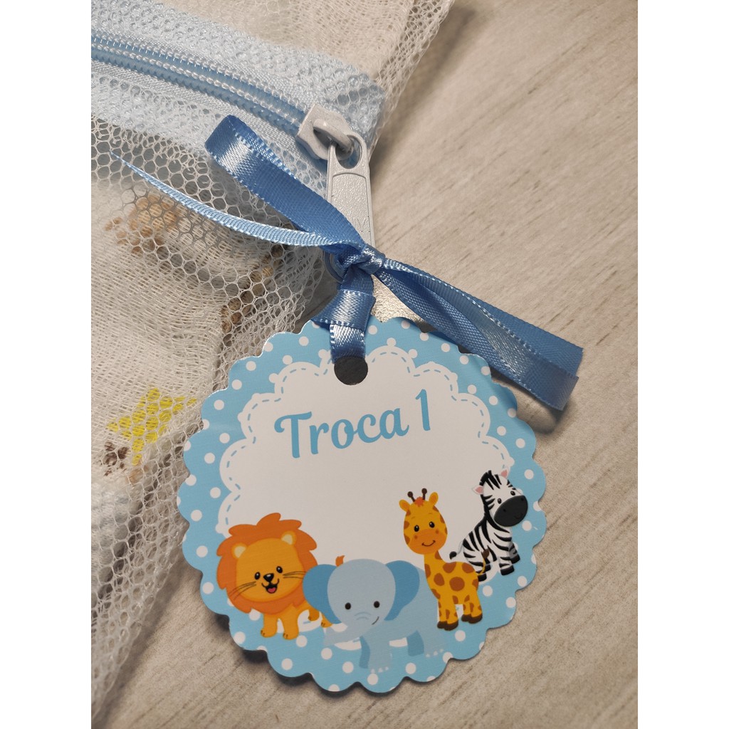 Saquinho Maternidade 6 Unidades Zíper Azul Bebê + Tags Safari Azul Bebê