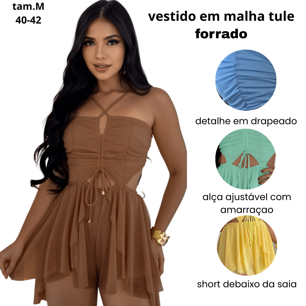 Vestido Macaquinho feminino tule premium com caimento leve amarração no pescoço drapeados Frontais