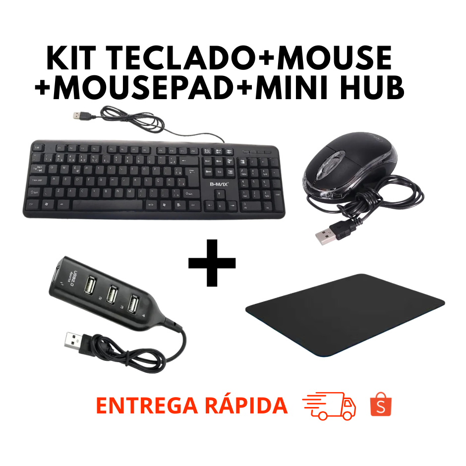 Comprar na ShopeeKit Mouse c/ Fio + Teclado c/ Fio + Mini Hub 4 Portas + Mouse Pad Home Office Jogos Games