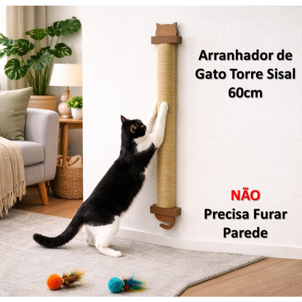 Arranhador Gatos Parede Vertical Poste Sisal 60cm Brinquedo Pet Casa Sem Furos Poste Refil Reposição