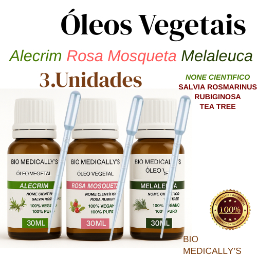 Comprar na ShopeeKit Óleos Vegetais Alecrim + Rosa Mosqueta + Melaleuca 3X30ml + Pipeta Dosadora (6PEÇAS)