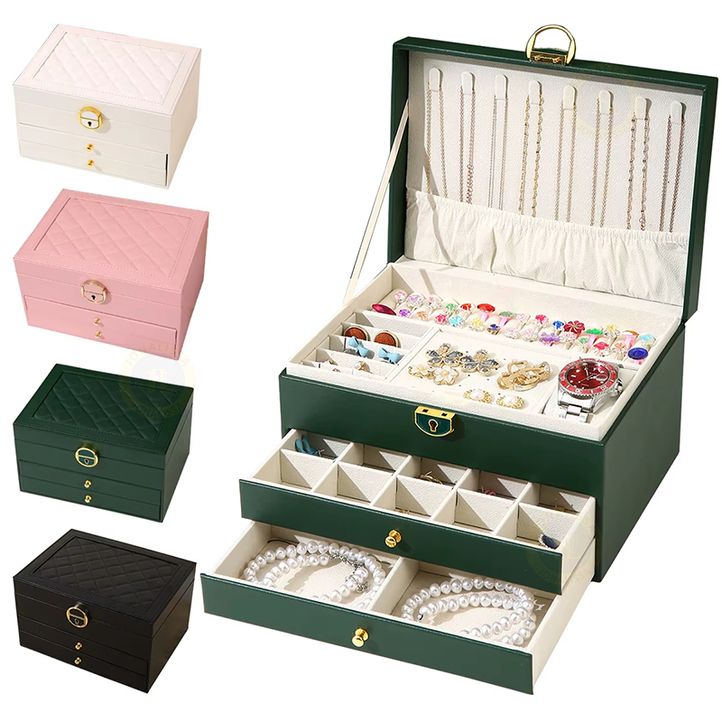Comprar na ShopeeCaixa de Joias Grande Multifuncional 3camadas Com 2 Gavetas Couro brincos organizar Porta joias Q19