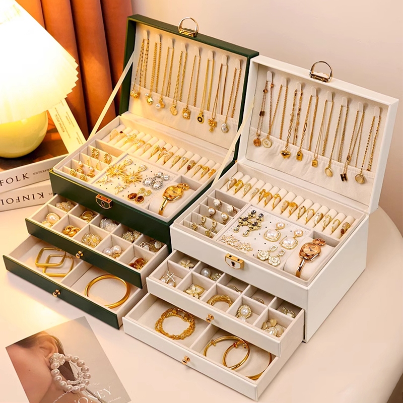 Caixa de Joias Grande 3 camadas Com 2 Gavetas Multifuncional couro Luxuoso Porta Joias com Chave Q19