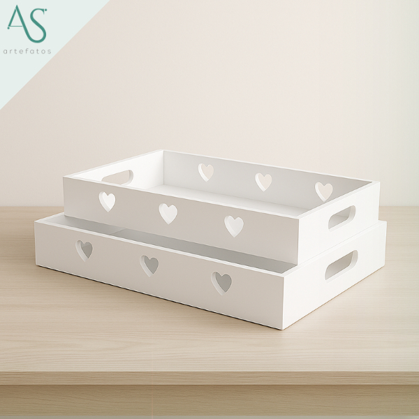 Kit Duas bandejas Corações P e M Em MDF Branco Decorações Casa
