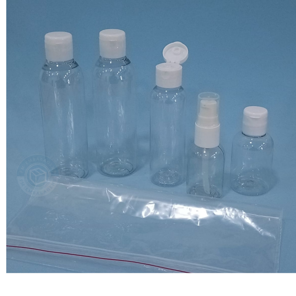 Kit Viagem 5 Frascos com Saco Zip 20x20 – Tampa Branca | Padrão ANAC