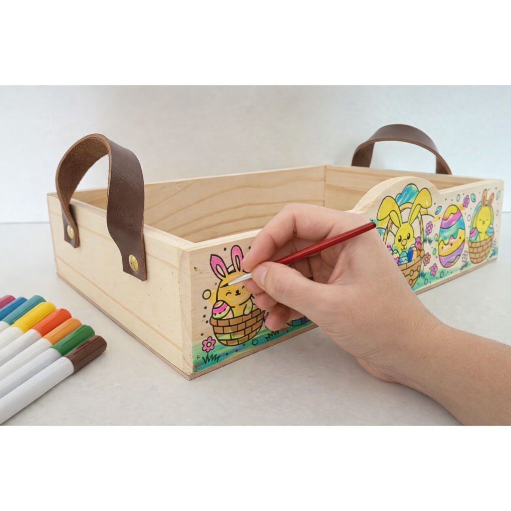 Comprar na ShopeePáscoa Bandeja em pinus para COLORIR com alça em couro cestaria presentes