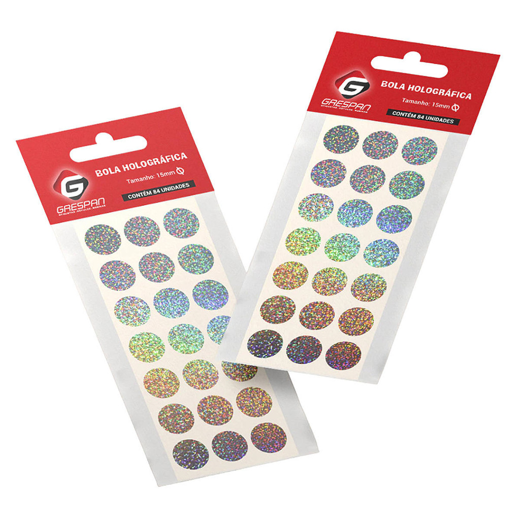 Comprar na ShopeeEtiqueta Bolinha 15mm Holográfica Grespan Cartela com 84 Etiquetas Adesivas para Codificação