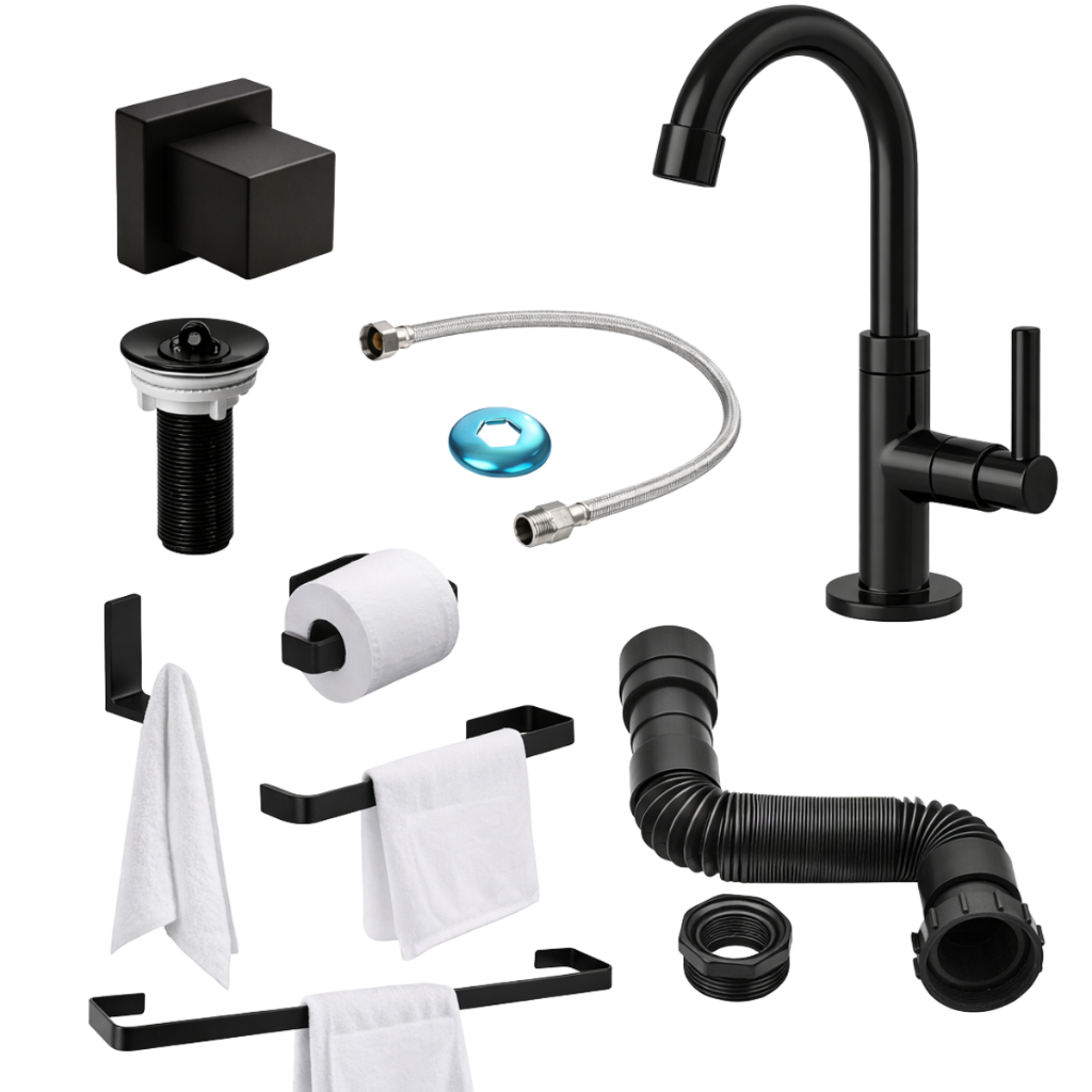 Comprar na ShopeeKit Acessórios Banheiro Preto Fosco Completo com Torneira Luxo Moderna + Sifão + Válvula + Engate Flexível