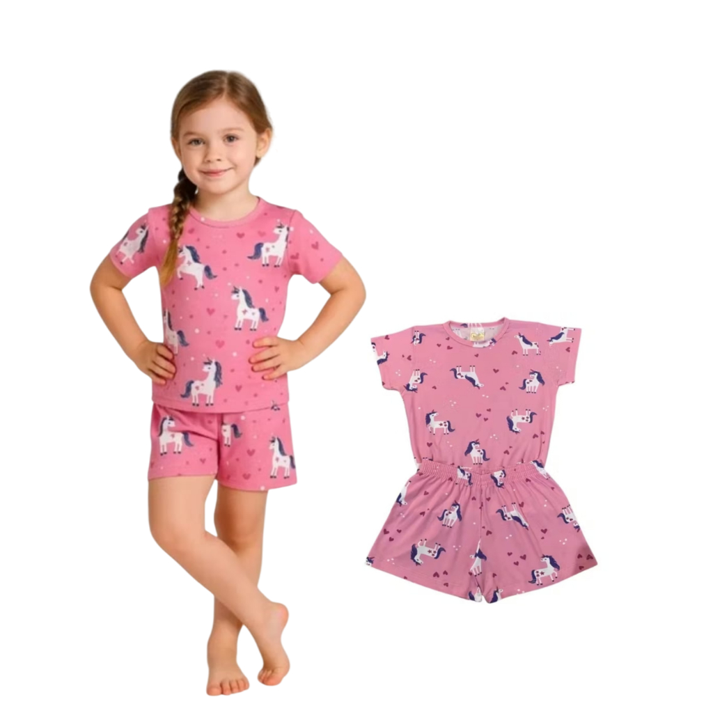 Comprar na ShopeePijama Infantil Menina Manga Curta – Conjunto Blusa + Shorts Confortável