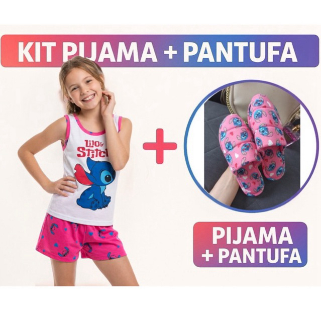 Comprar na ShopeeKIT PIJAMA REGATA FEMININO INFANTIL + PANTUFA STITCH