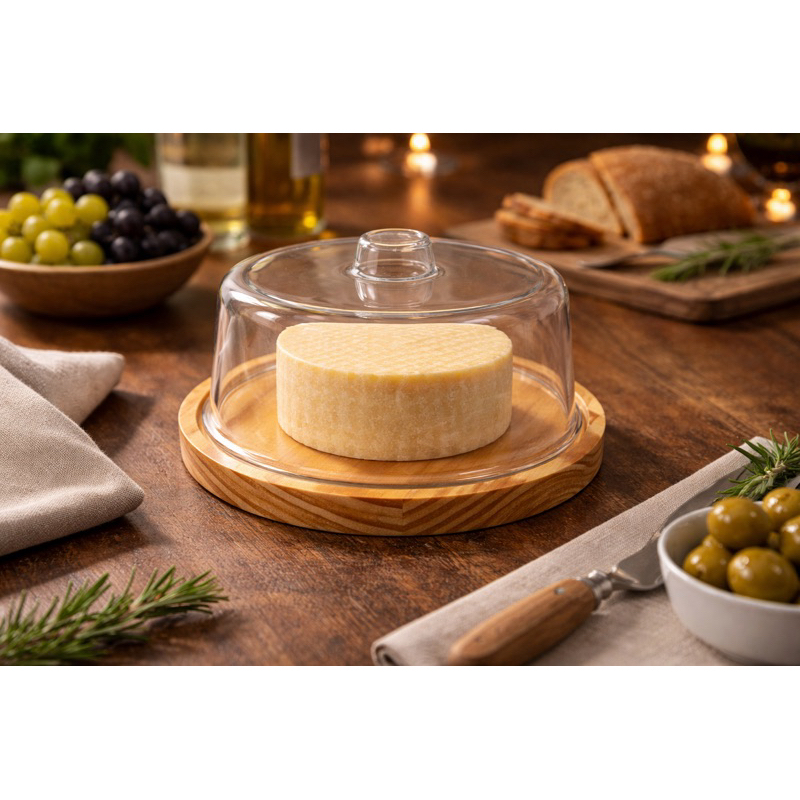 Queijeira de Madeira e Tampa Acrílica Premium Porta Queijos e Bolos Grande 25 cm