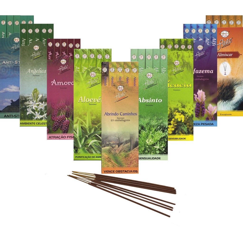 Comprar na ShopeeIncenso Flute Caixa com 25 Embalagens e 8 varetas cada. Total 200 varetas.