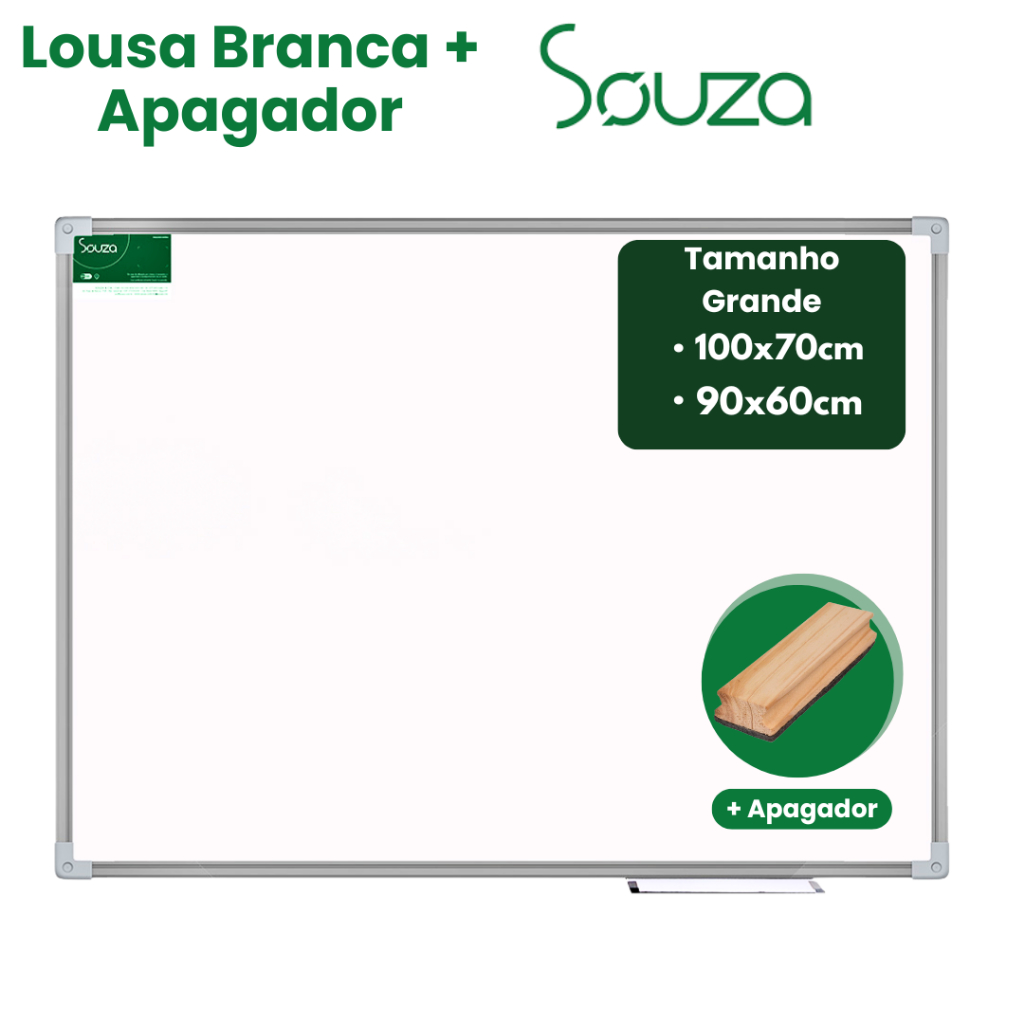 Lousa Branca Quadro Escolar 100×70 cm / 90×60 cm – Completo (Moldura + Apagador Souza)