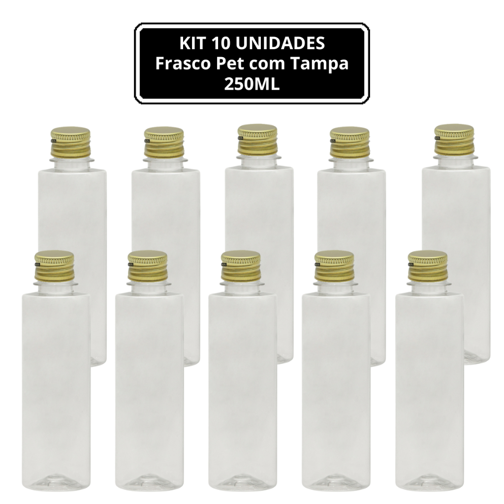 Comprar na Shopee10 UNIDADES - FRASCO PET TRANSPARENTE (250ml) RETO ALTO com TAMPA ALUMINIO DOURADA -