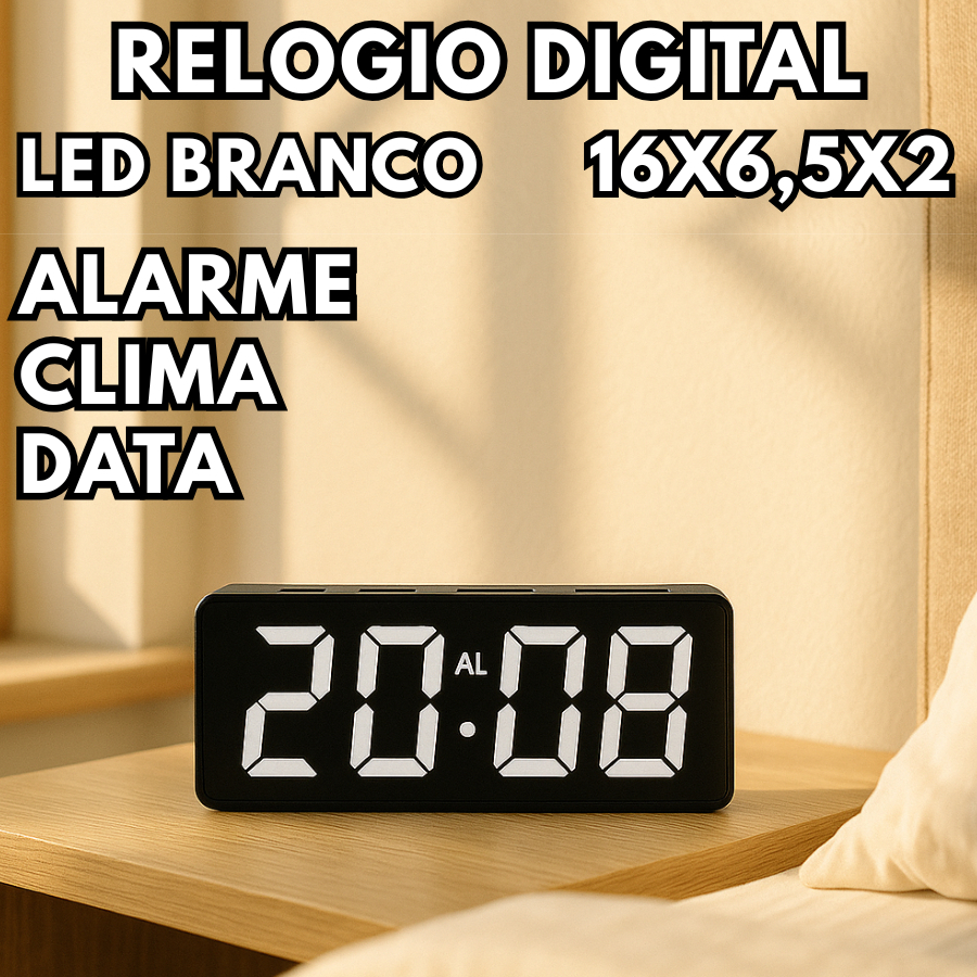 Comprar na ShopeeRelogio De Led Digital 16X6,5X2 Alarme Leds Brancos Para Mesa E Parede Data Temperatura