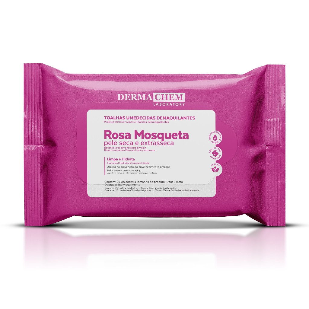 Toalhas Umedecidas Demaquilantes com Rosa Mosqueta 25 Lenços Limpeza e Hidratação da Pele Dermachem