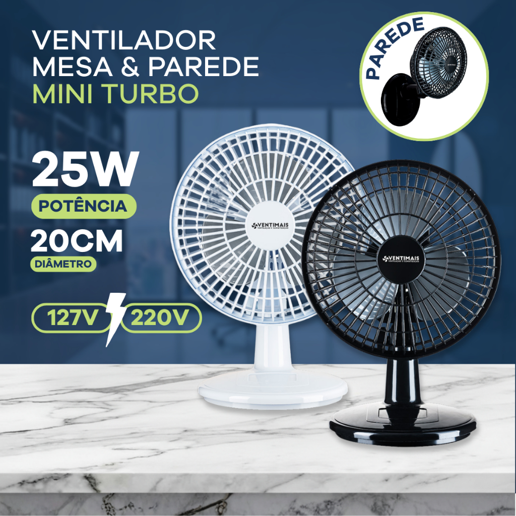 Comprar na ShopeeVentilador Mini Turbo 20cm 2 em 1 Mesa/Parede Portátil 3 Pás 110/220V Branco Preto Escritório Maeto