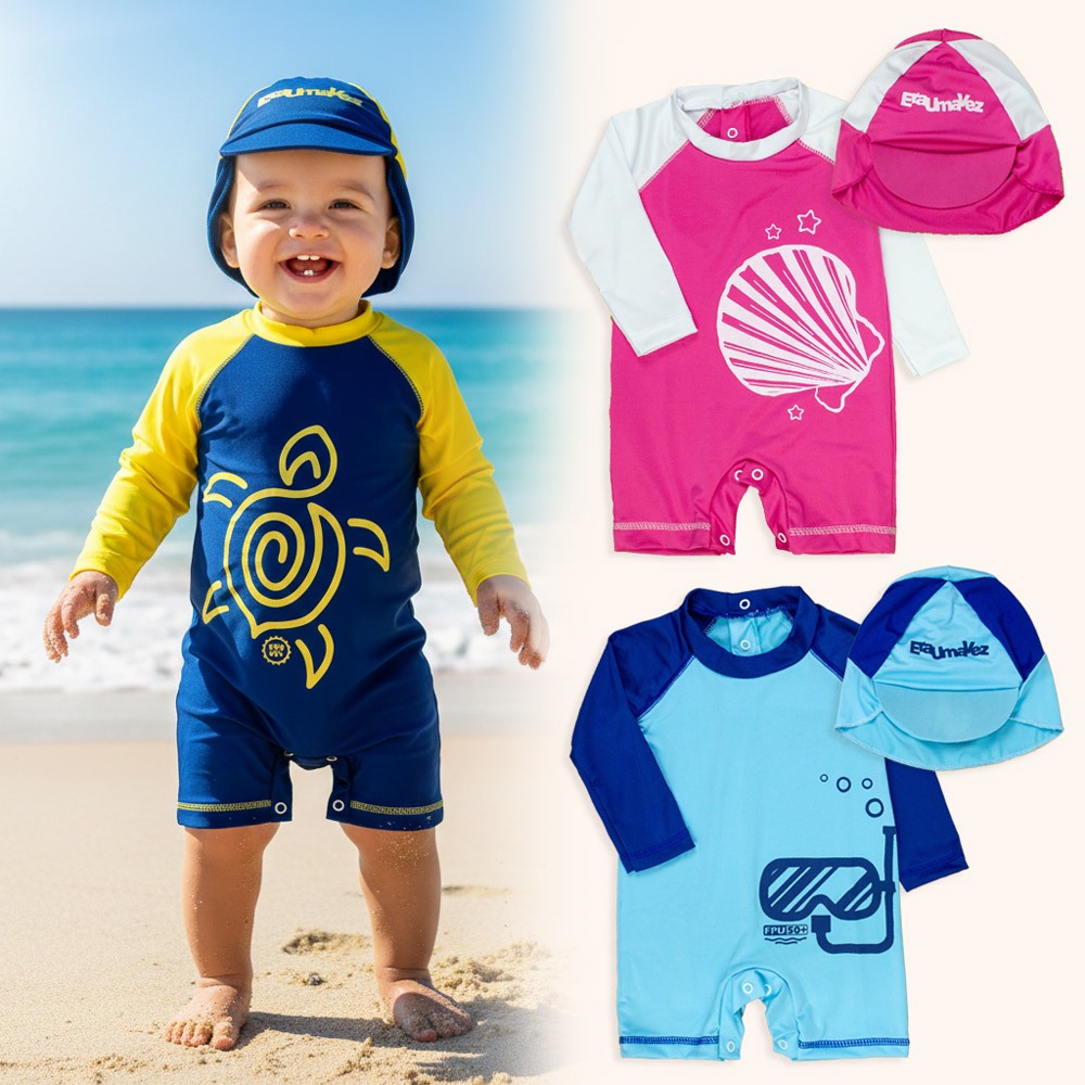 Kit Bebê Proteção UV50+ com Macacão Curto e Chapéu de Sol – Verão