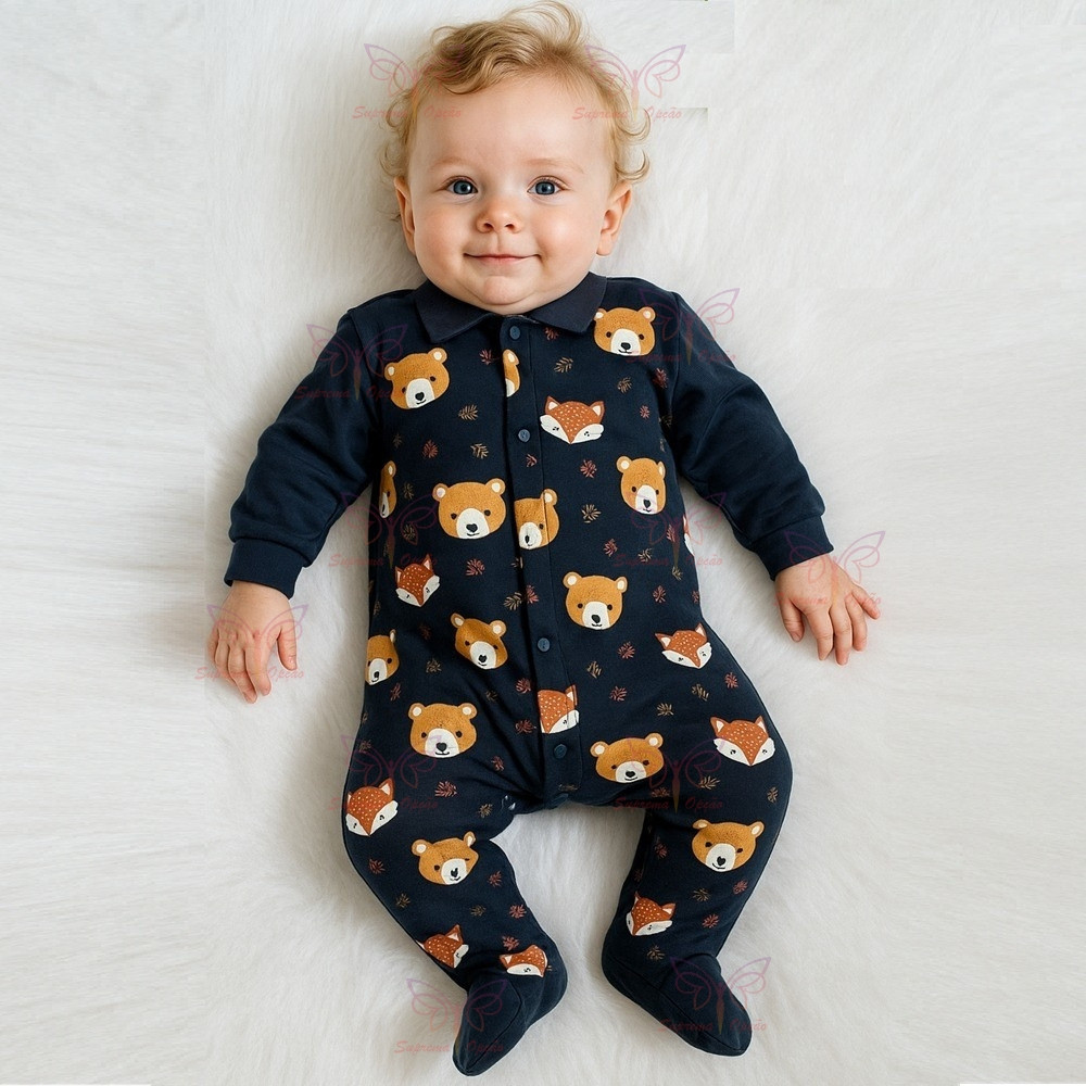 Comprar na ShopeeMacacão Manga Longa Vira Pé Bebê Menino – Estampa Ursinho e Raposa RN a 03 Meses