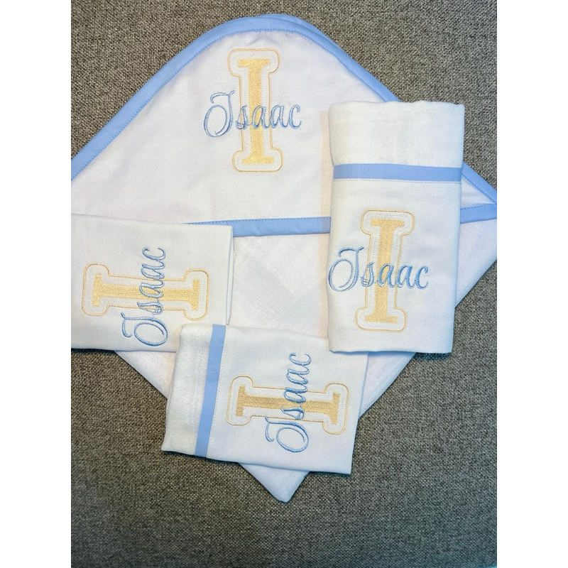 Comprar na ShopeeKit Enxoval Bebê Personalizado 4 Peças Bordado – Panos de Boca, Fralda de Ombro e Toalha com Capuz 100% Algodão