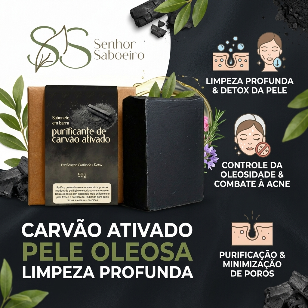 Comprar na ShopeeSabonete Purificante Pele oleosa Acne Carvão Ativado Vegetal com Óleo Essencial de Alecrim e Gerânio - Skin Care 90g
