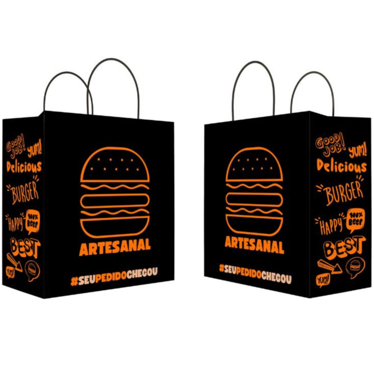 Sacola Kraft Preta Com Alça Para Hamburguer C/ 50 Unid - Lanches, Burguer Artesanal, Gourmet