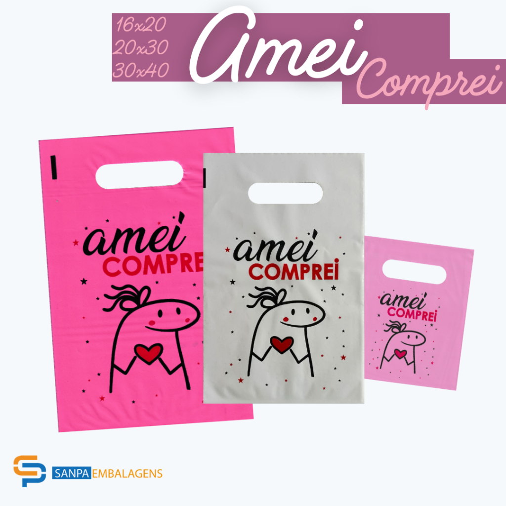 Sacola Impressa Amei Comprei kit com 50 ou 100 unidades - Sacola plástica, loja, brindes, roupas