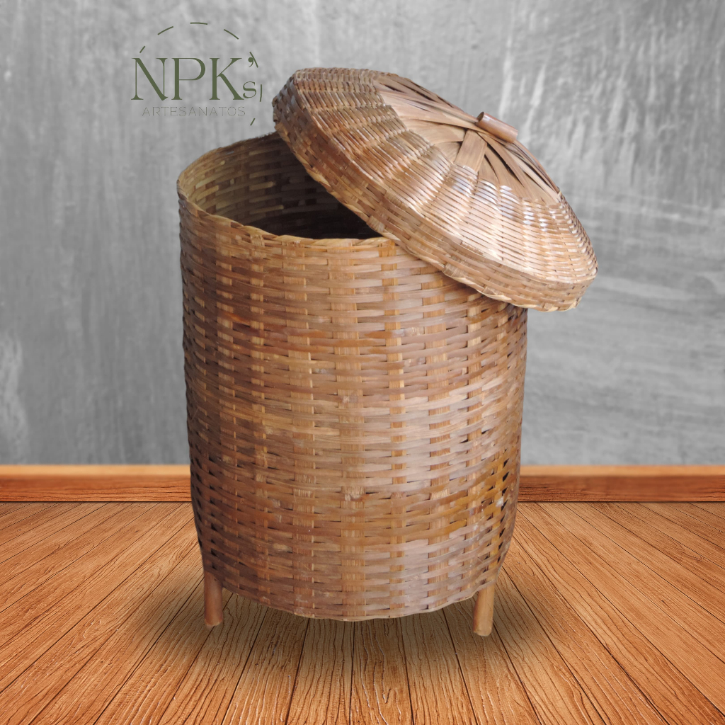 Cesto de Roupa Suja 72 LITROS Lavanderia Bambu c/ Tampa Retangular Forrado Quarto Banheiro Dobrável