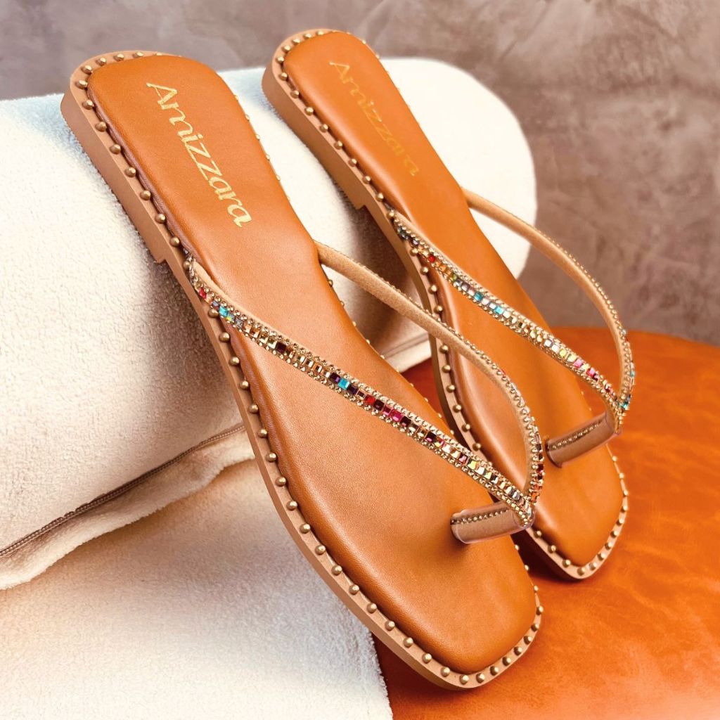 Sandália Rasteirinha Chinelinho Tira de Brilho Strass Colorido Confortável Casual Amizzara