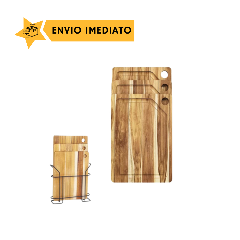 Kit 3 Tábuas Legumes Verduras Carne Madeira Teca C/ Suporte - STOLF