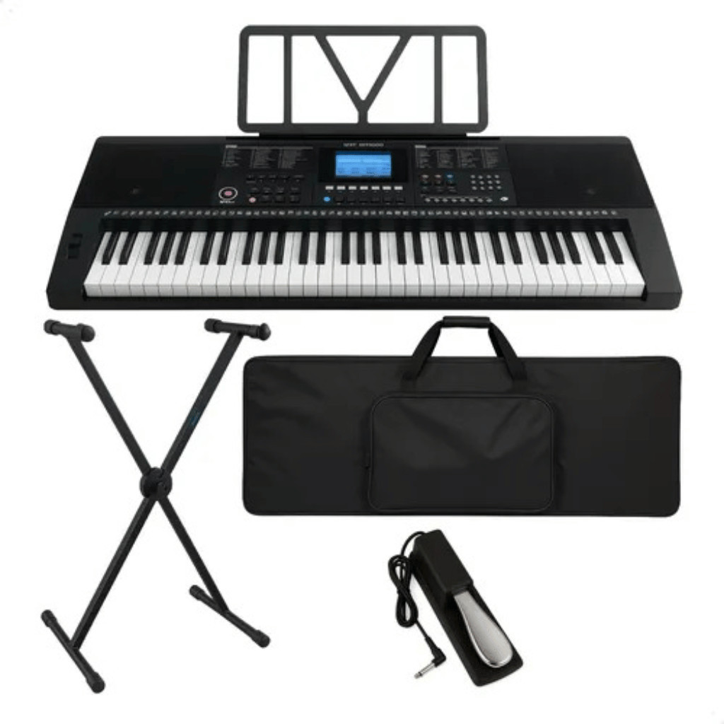 Kit Teclado Piano Sensitivo Profissional 61 teclas 500 timbres Arranjador + Sup/partitura Com Suporte/Capa/Pedal
