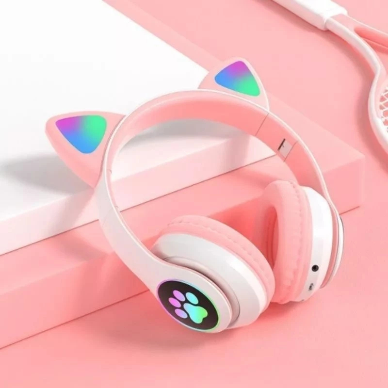 Fone de Ouvido Gatinho Bluetooth LED Sem Fio Dobrável Infantil Ajustável com Microfone