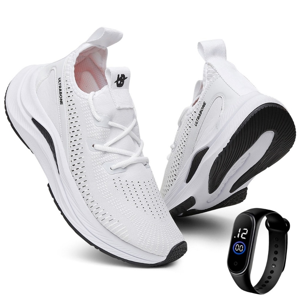 Tênis Esportivo Branco De Academia Dia a Dia + Relógio De Pulso Digital