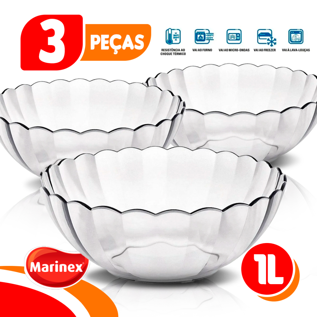 Comprar na ShopeeKIT 3 Tigelas Saladeira Bella Bowl Marinex 1L Vidro Sobremesa Forno Micro-ondas Multiuso Culinária
