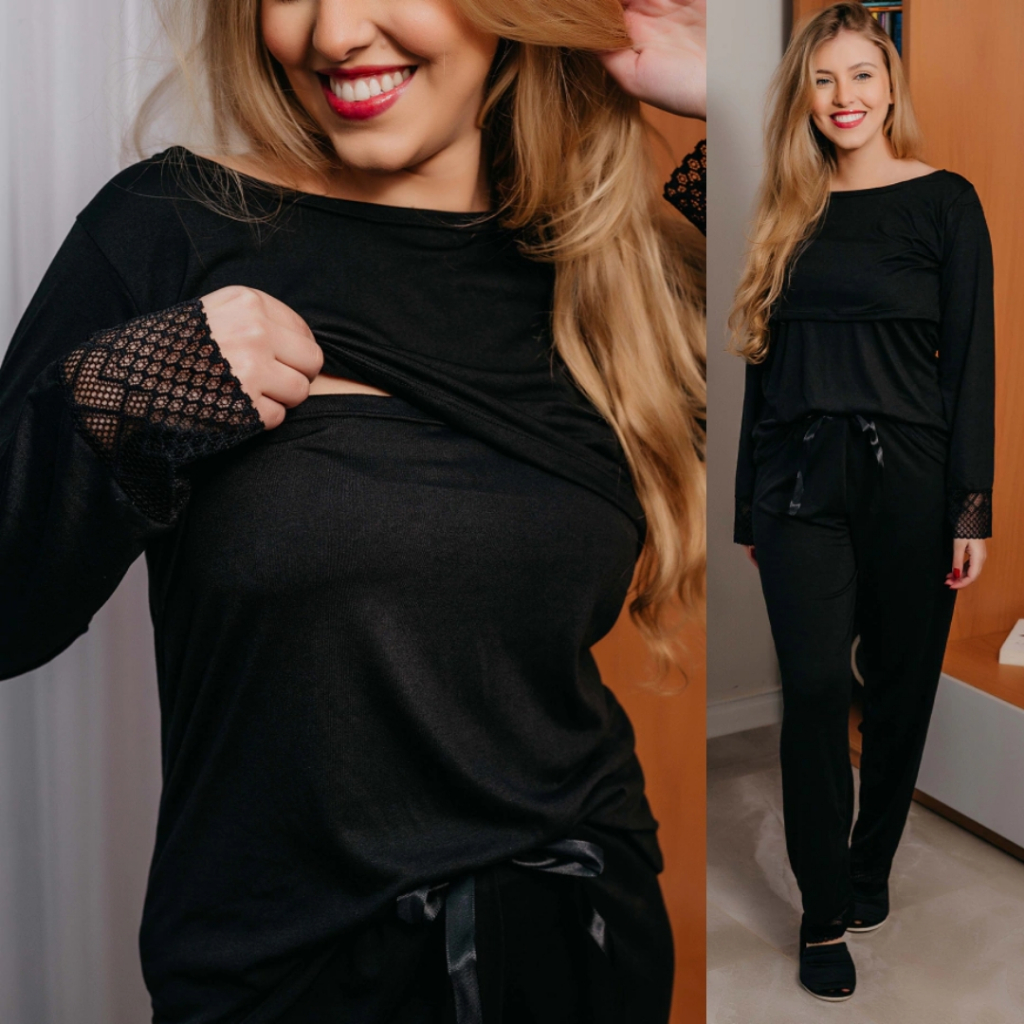 Comprar na ShopeePijama Amamentação Longo Calça e Blusa Soft Fluffy Com Renda
