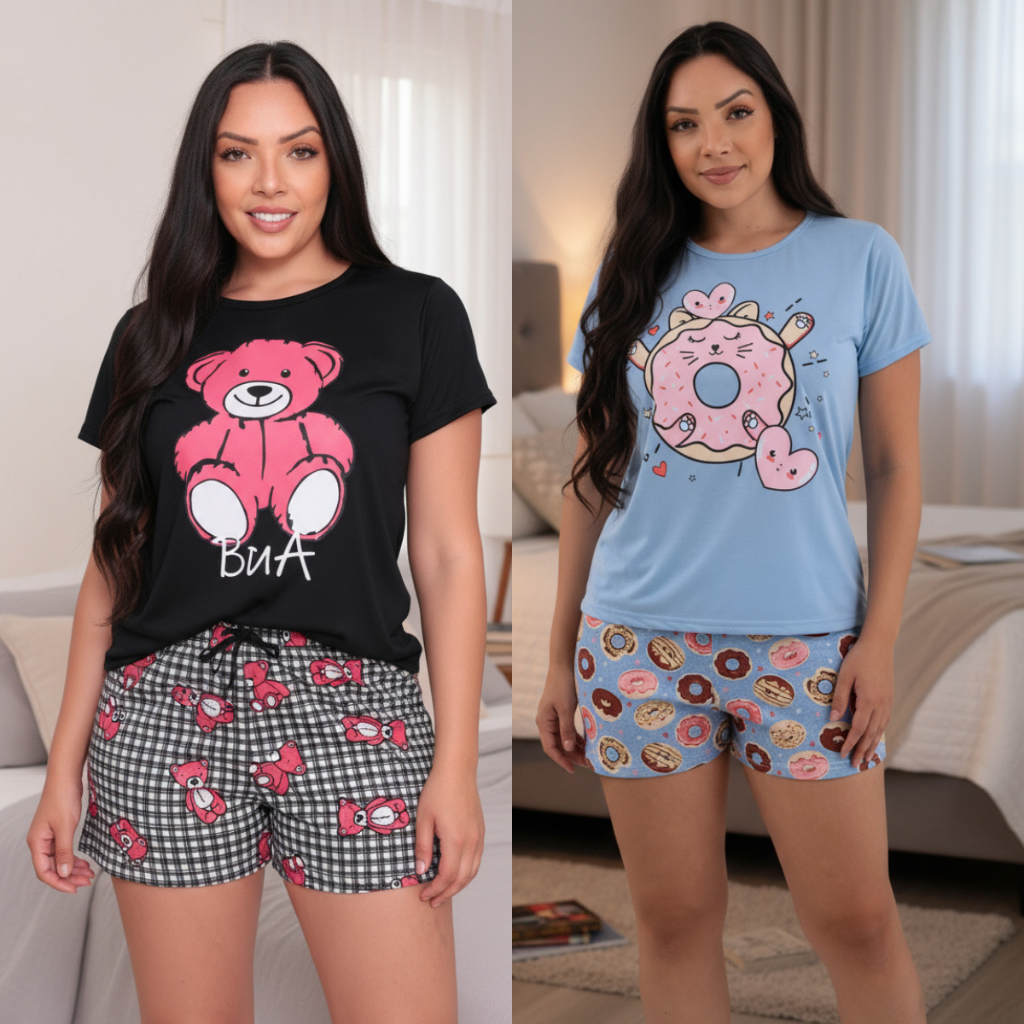 Comprar na ShopeeKit com 3 Baby Doll Regata Pijama de Verão Short Doll em Malha de Qualidade Estampas Sortidas