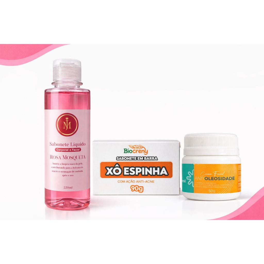 Kit Tratamento de Manchas e Espinhas Sabonete Líquido Mikoziu, Sabonete Barra e Pomada Xô Espinha