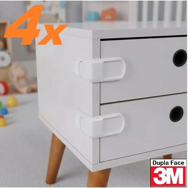 4 Travas Lateral de Gaveta Branco Segurança Bebê - Adesivo 3M VHB