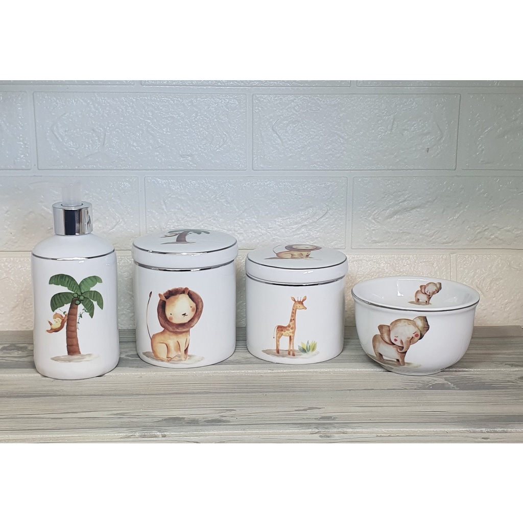 Comprar na ShopeeKit 4 Potes Organizador Higiene Safari Porcelana Com Filete Prata