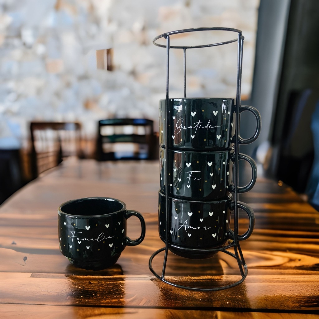 Jogo De 4 Xícaras Porcelana Preta Fé Familia + Suporte Metal Kit