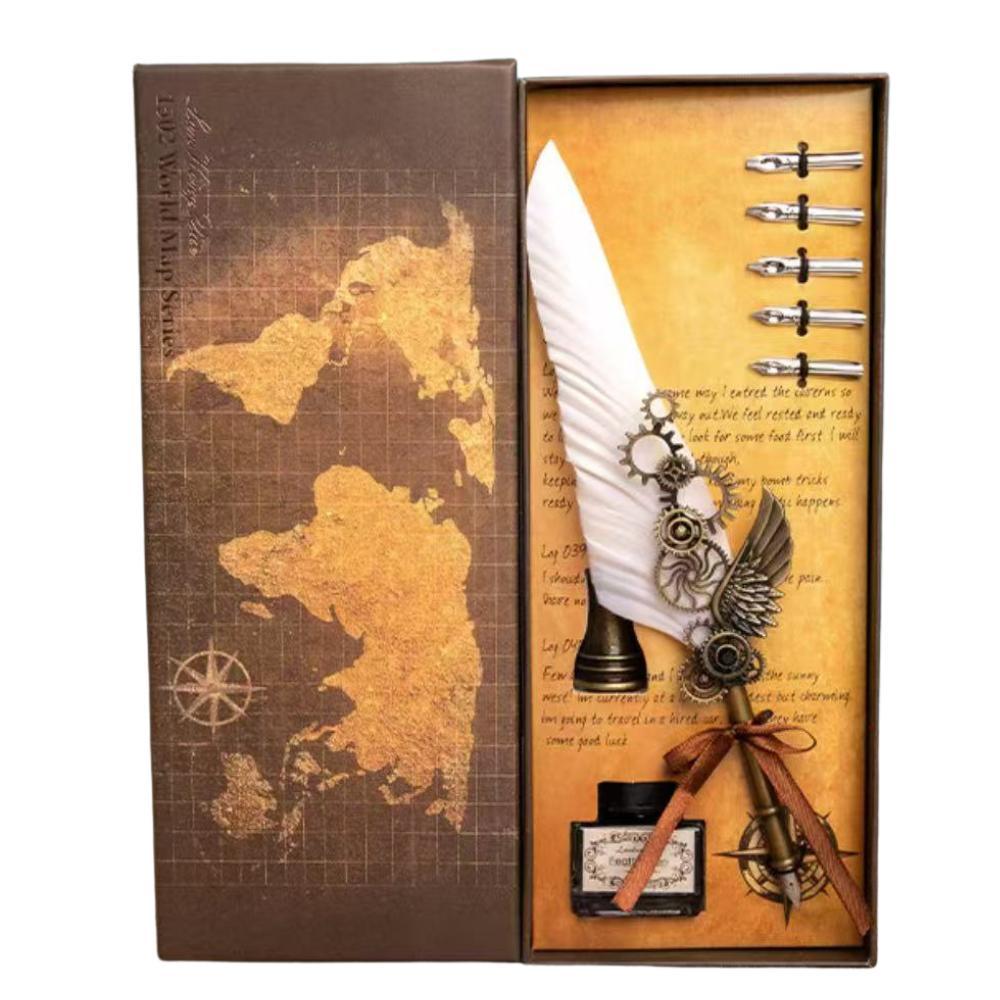 Caneta de Pena Vintage com Suporte Tinteiro e Carimbo - Kit de Escrita ou Decoração | ShopRank