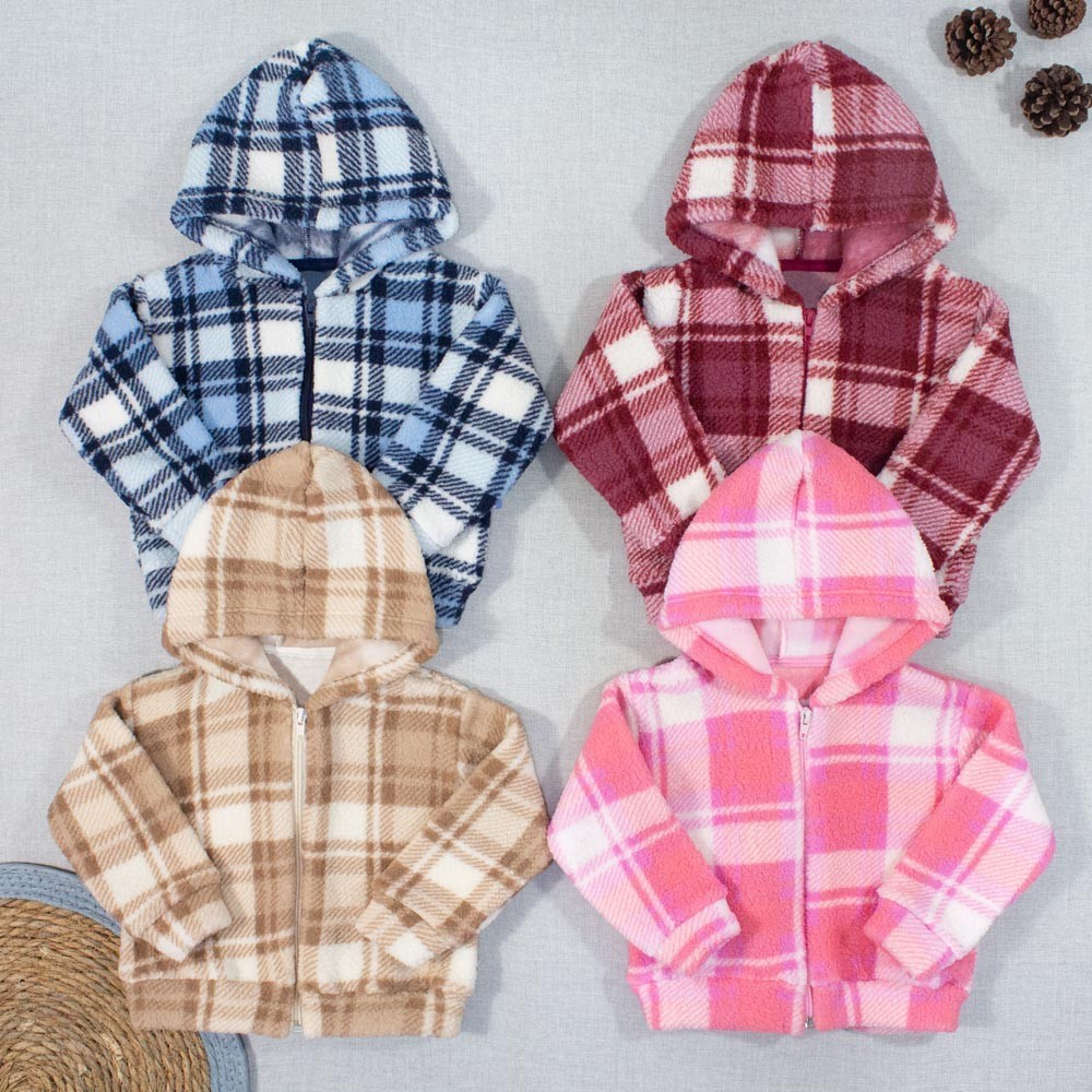 Casaquinho para Bebê Xadrez Pelúcia Sherpa de Zíper com Capuz até 12 Meses | ShopRank