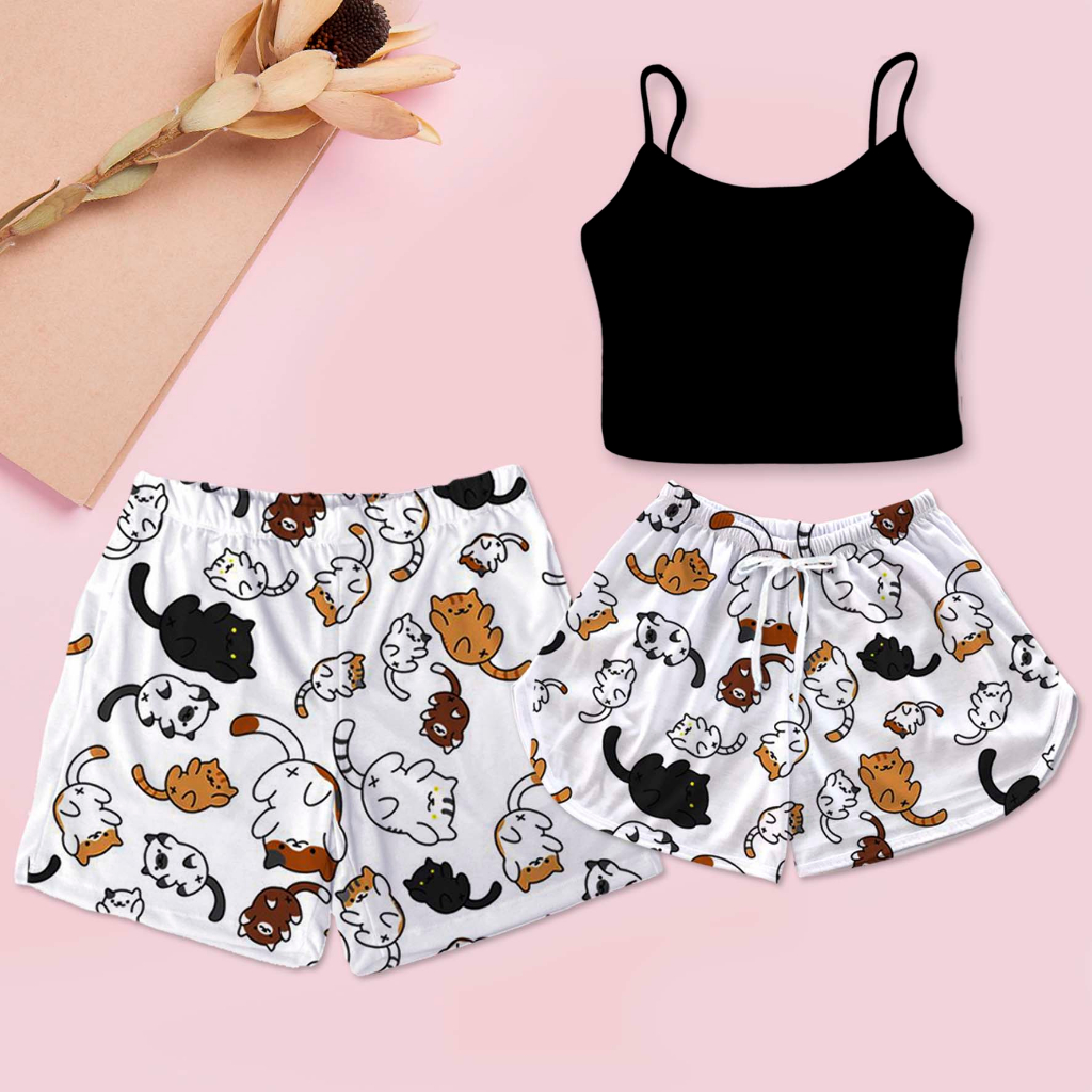 Kit Pijama de Casal Amor Para Dormir Cropped Preto Gatinho + Shorts Samba Canção | ShopRank